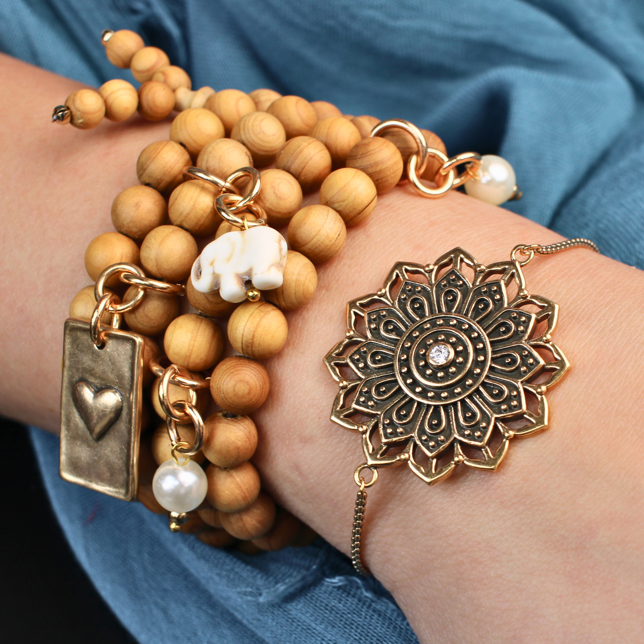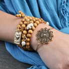 Goddess Wood Boho Wrap – Made with 8mm natural wood beads and finished with a gold pendant, it's a a grounding symbol of feminine strength and divine grace. Features (1x) off-white Howlite elephant bead and (x2) pearl accents. Length 15"; Comes with a magnetic clasp.