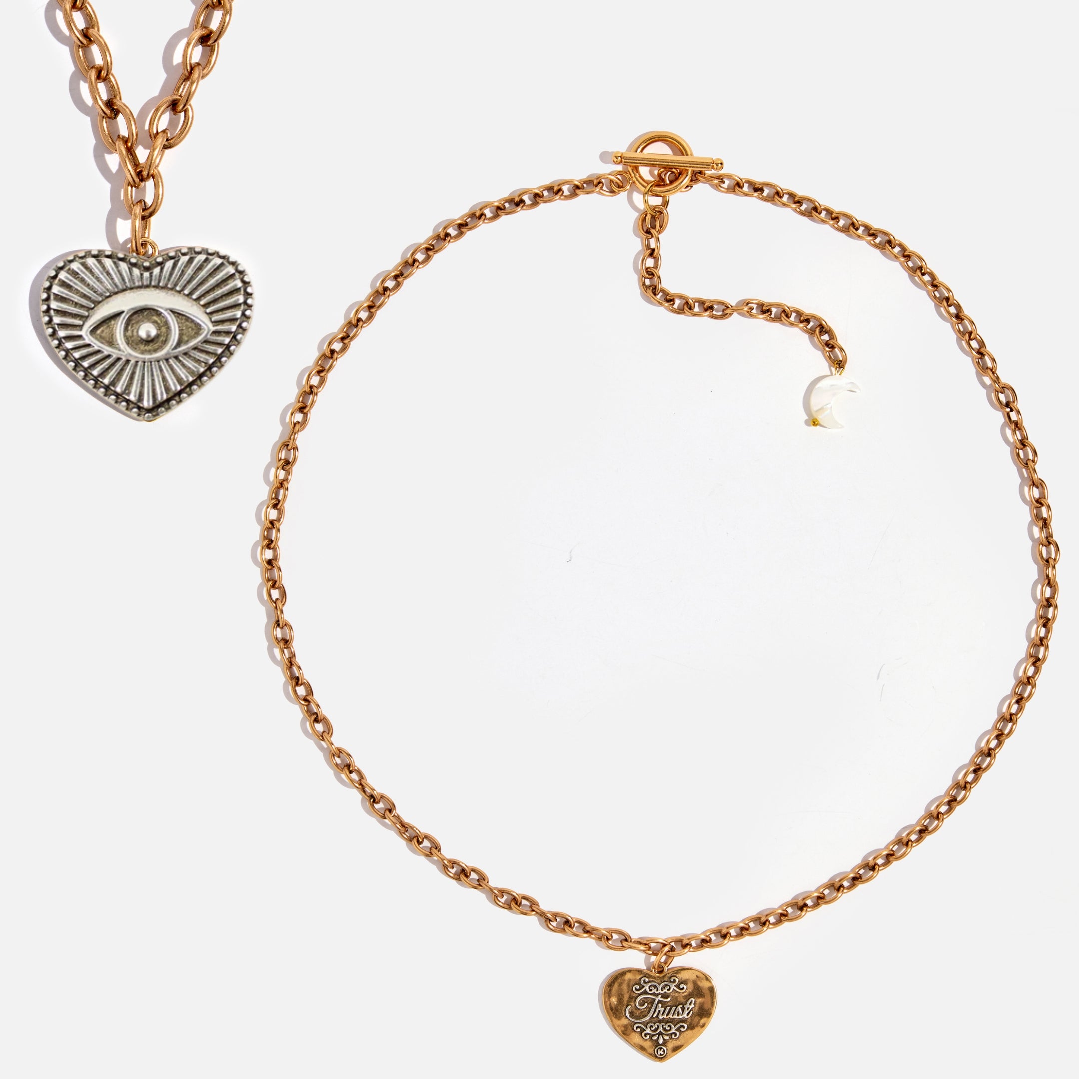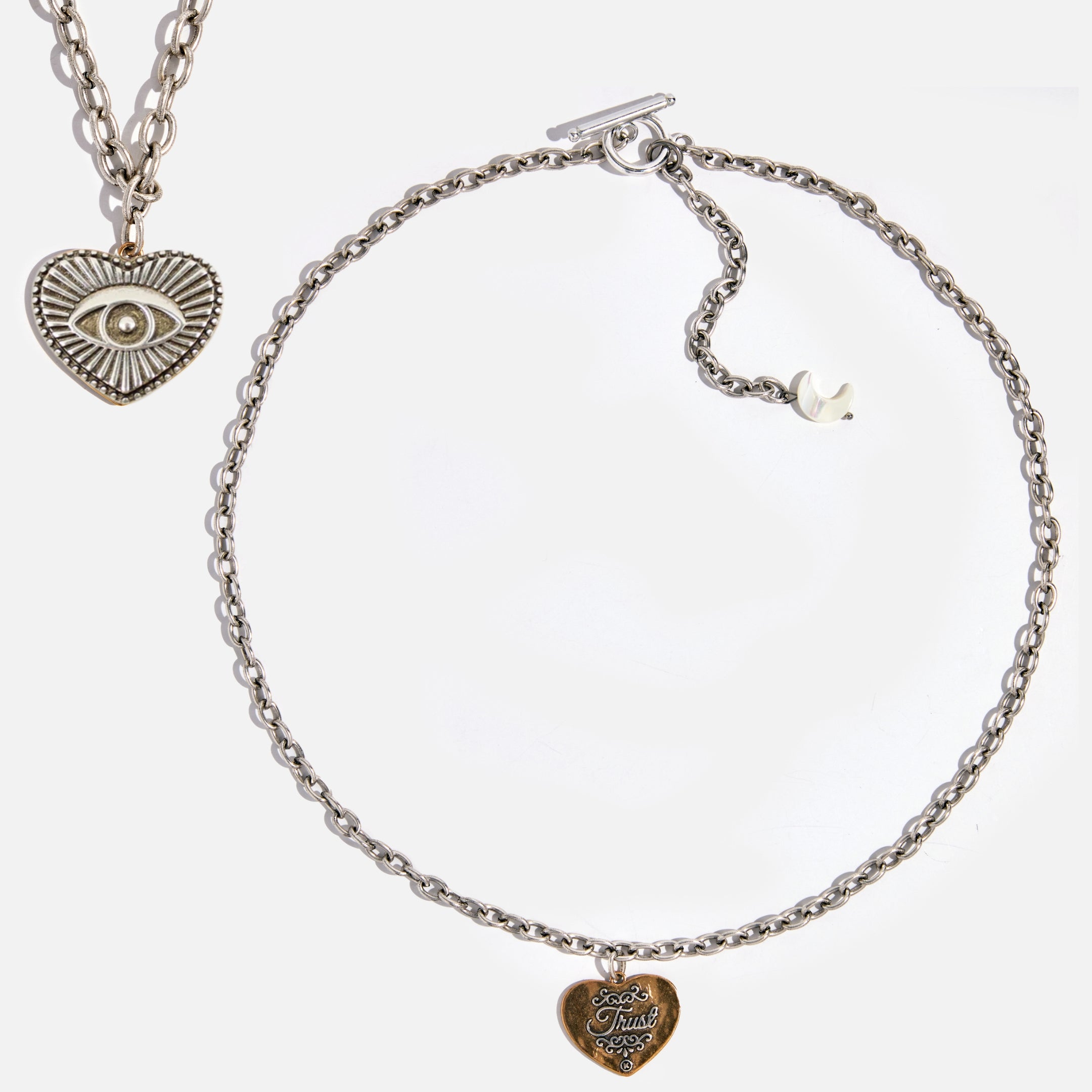 Chain choker with mixed-metal heart pendant; back toggle closure with 3" tail and pearl moon.