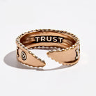 Mixed-metal ring with raised crescent moon phase design; message inscribed on band interior.