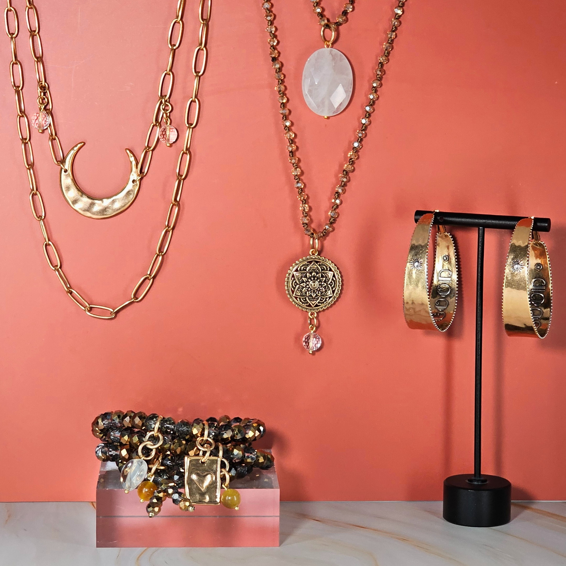 The Trust What Comes Quad Set is a gentle reminder to release control, stay open, and allow life to unfold in its own timing. The Embrace the Unknown Heart Crystal Boho Wrap begins the layering story with soft crystal radiance and a heart full of hope. Paired with the Light Crescent Moon Long Chain Necklace, inscribed with Light on the back, the look expands with a sense of presence and emotional ease. The Grateful Thankful Blessed Mandala Bloom Original Necklace adds grounding warmth through faceted beige crystals and natural quartz. Completing the stack, the It’s All Good Hoop Earrings offer a daily, wearable reminder to soften your expectations and trust your path.