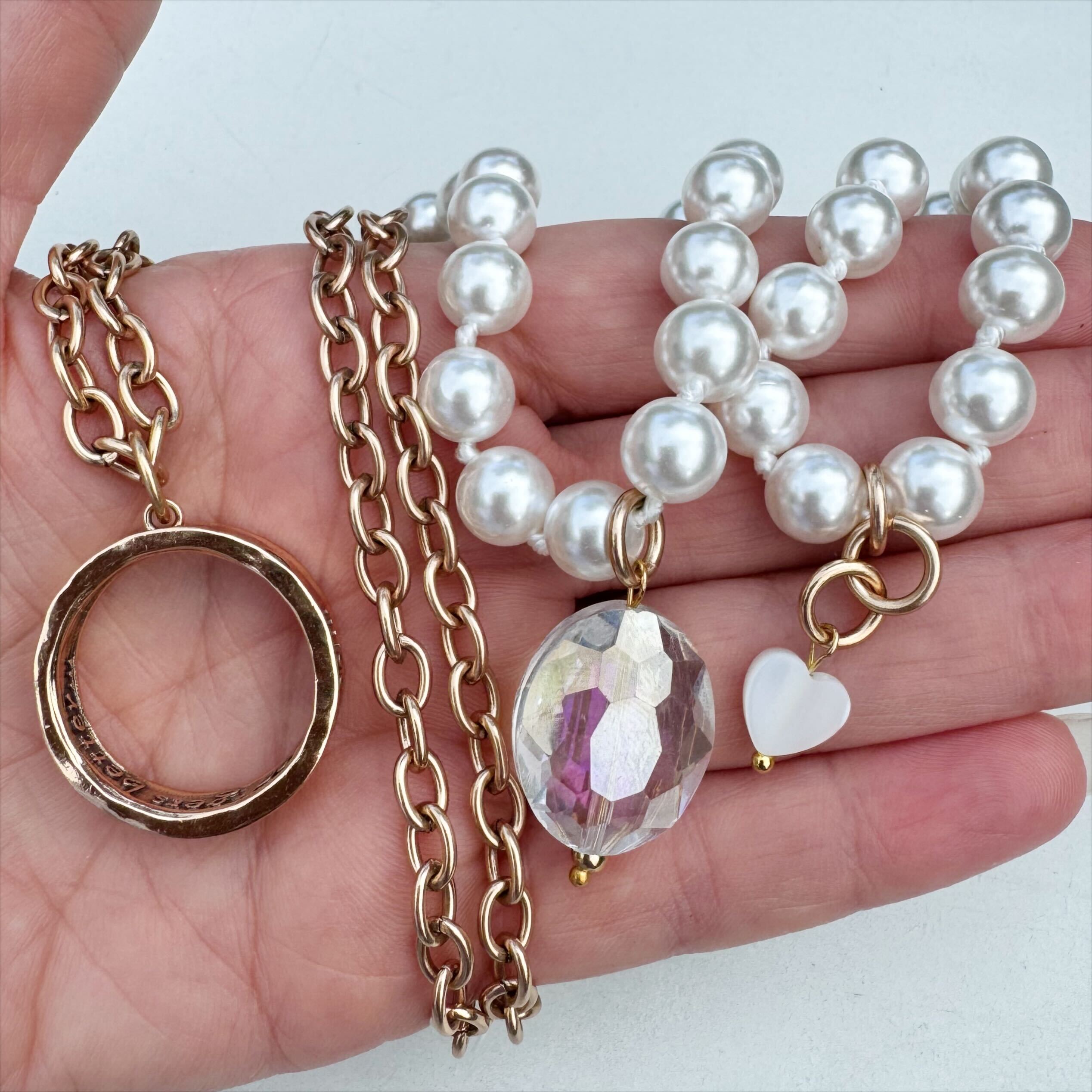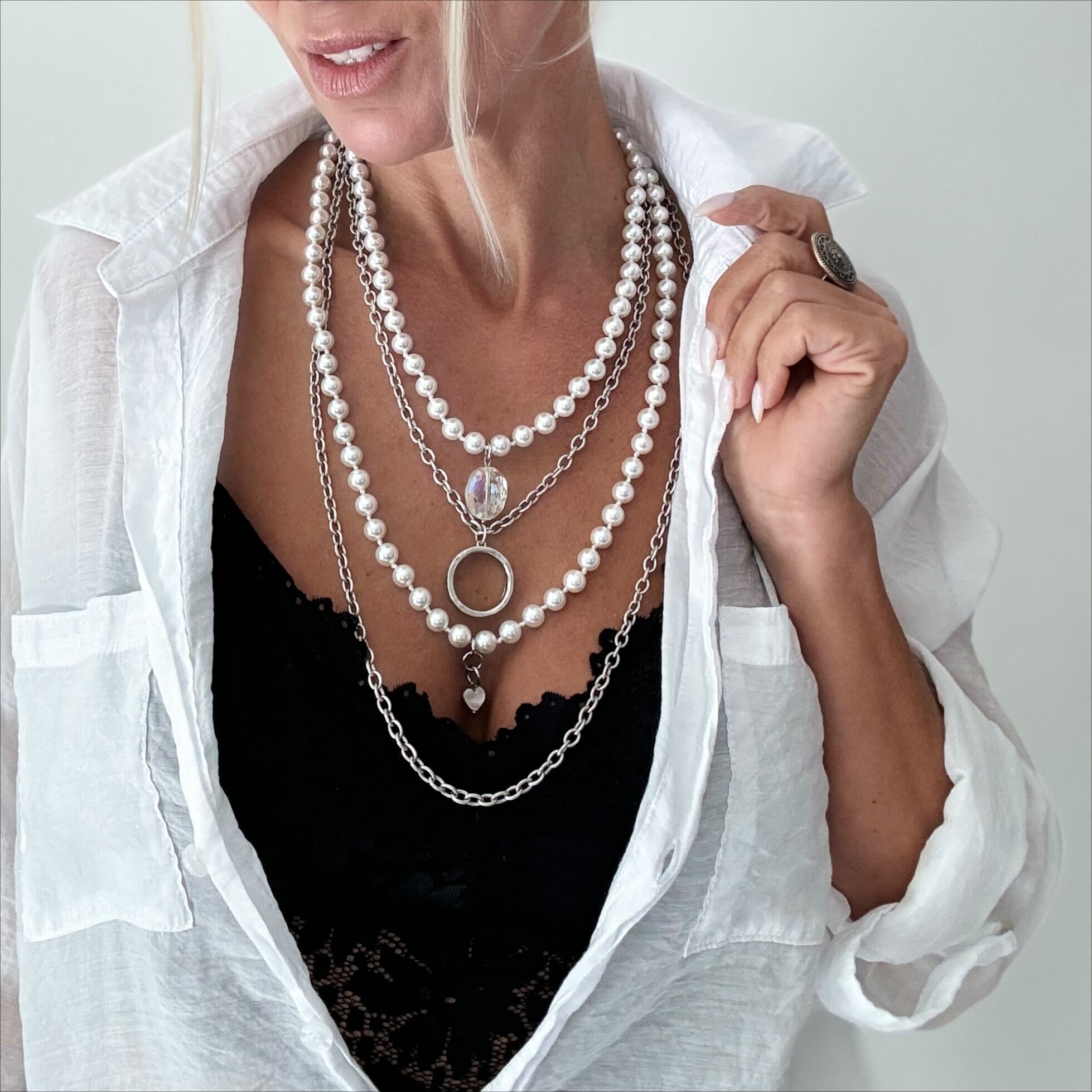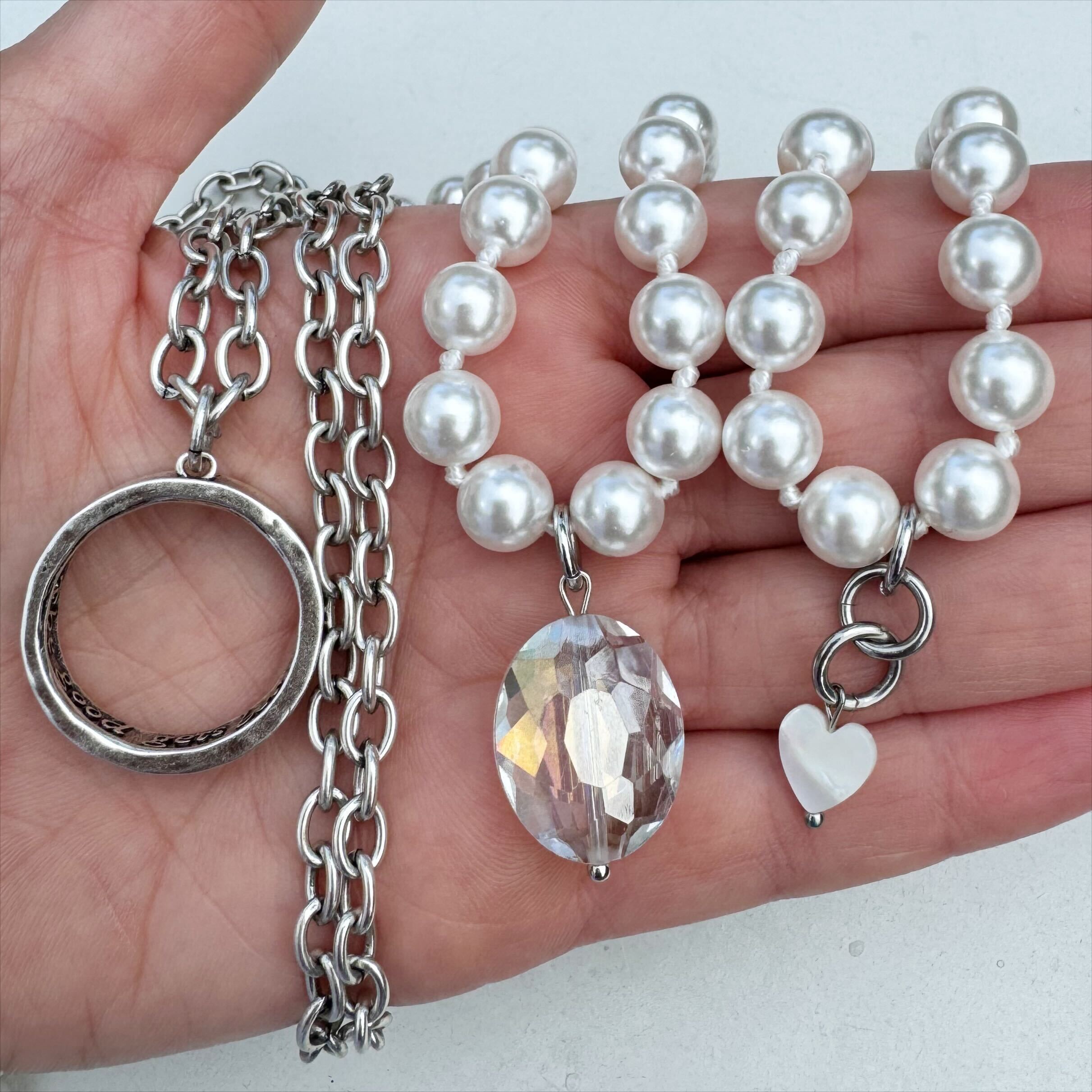 (1) Fusion: 40" 8mm white pearl beads with faceted crystal and pearl heart (no pendant)