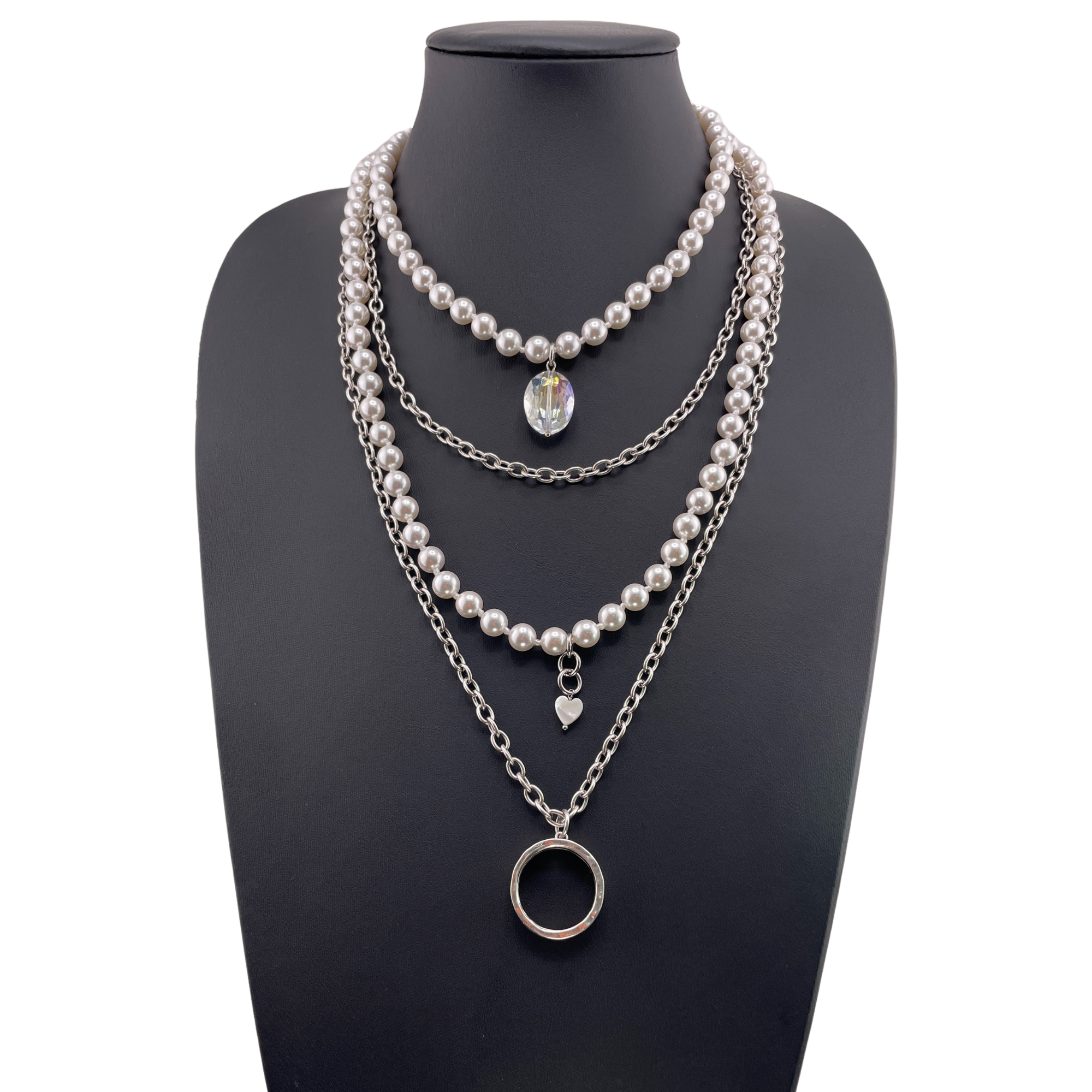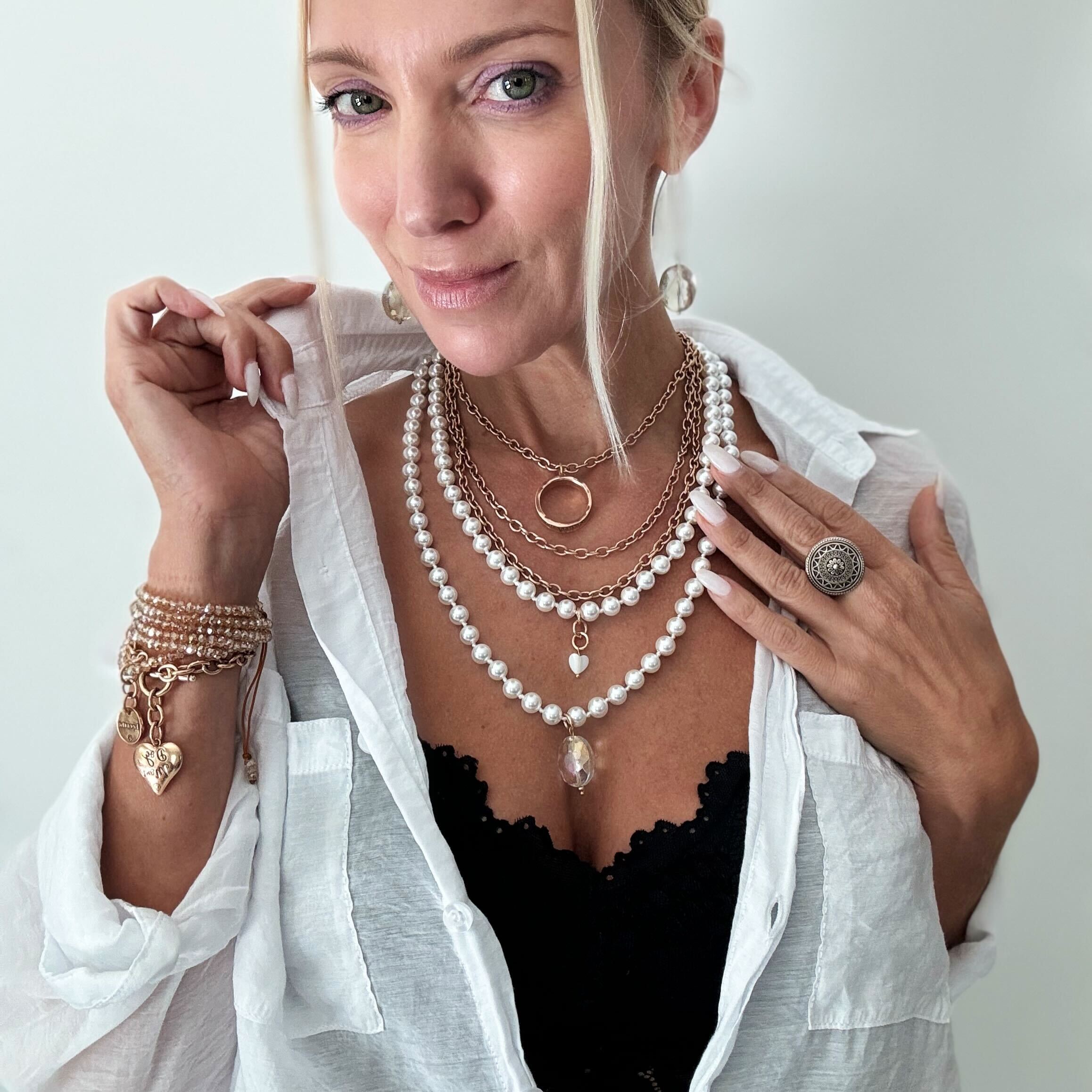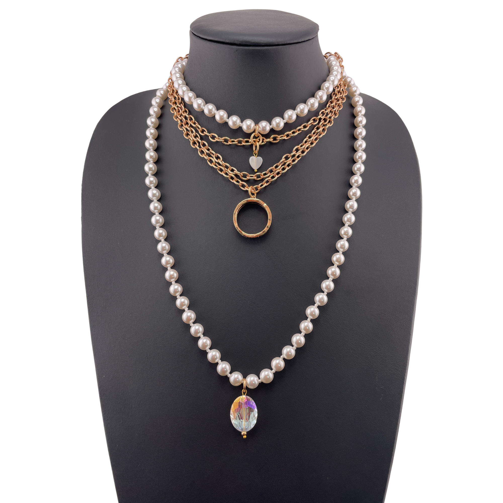 (1) Fusion: 40" 8mm white pearl beads with faceted crystal and pearl heart (no pendant)