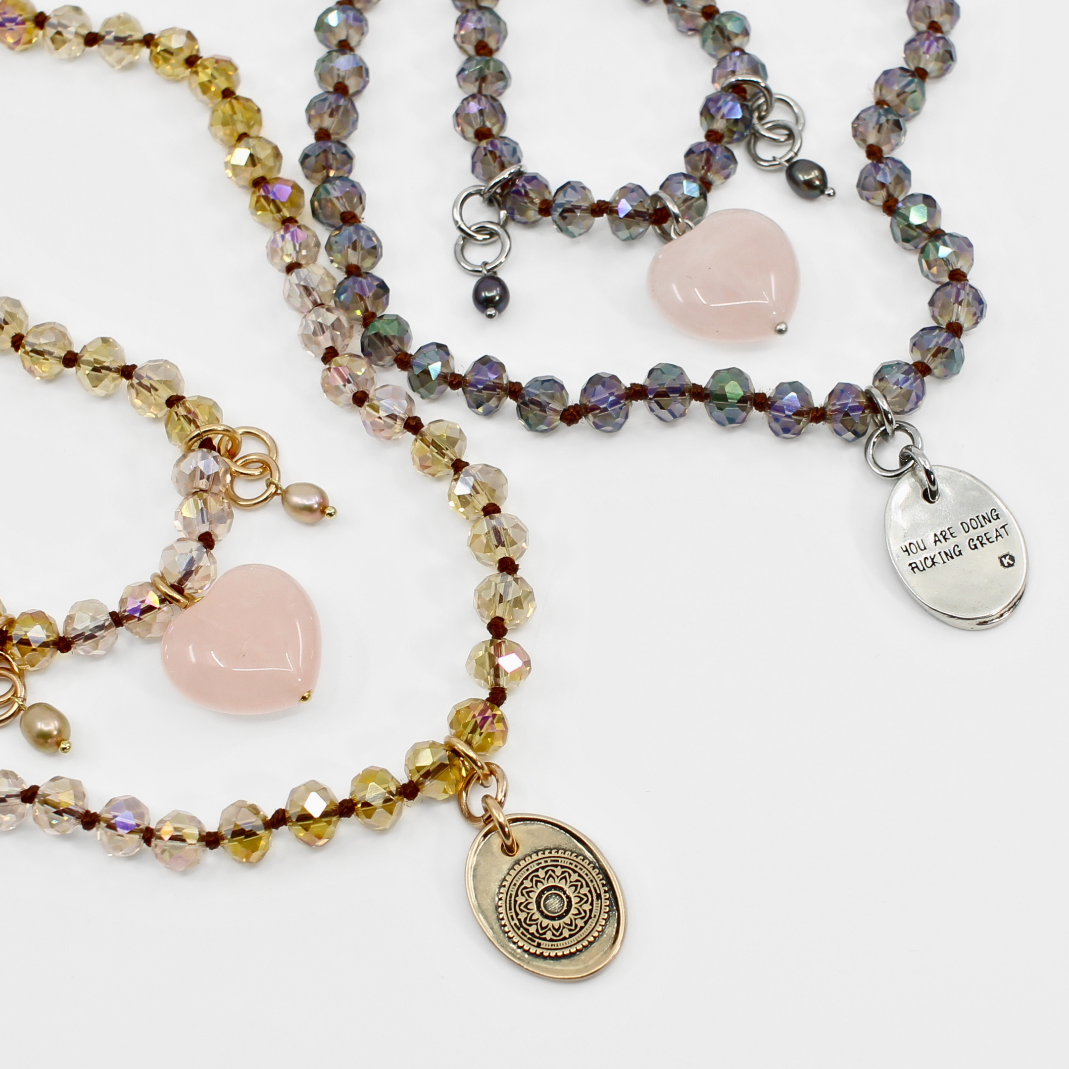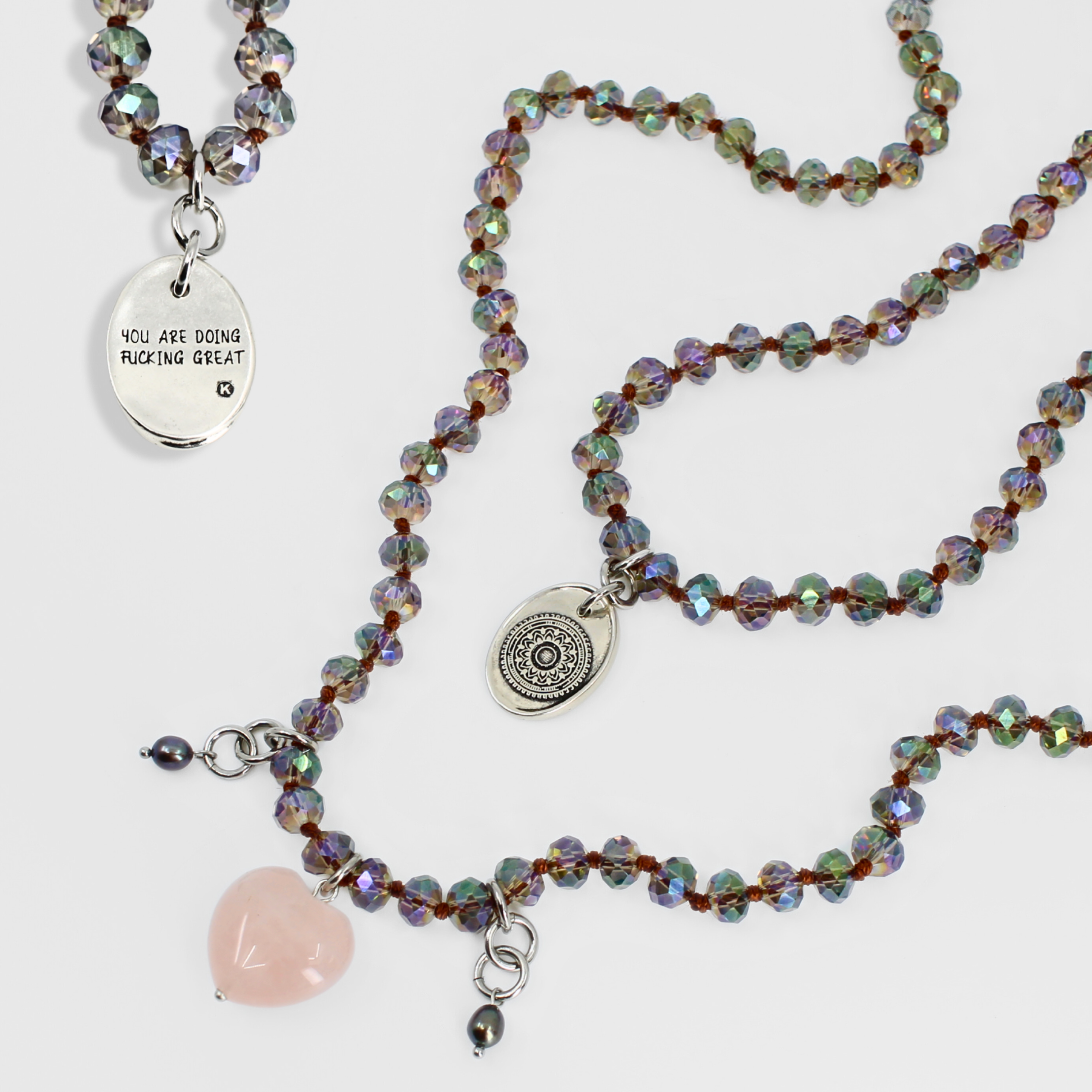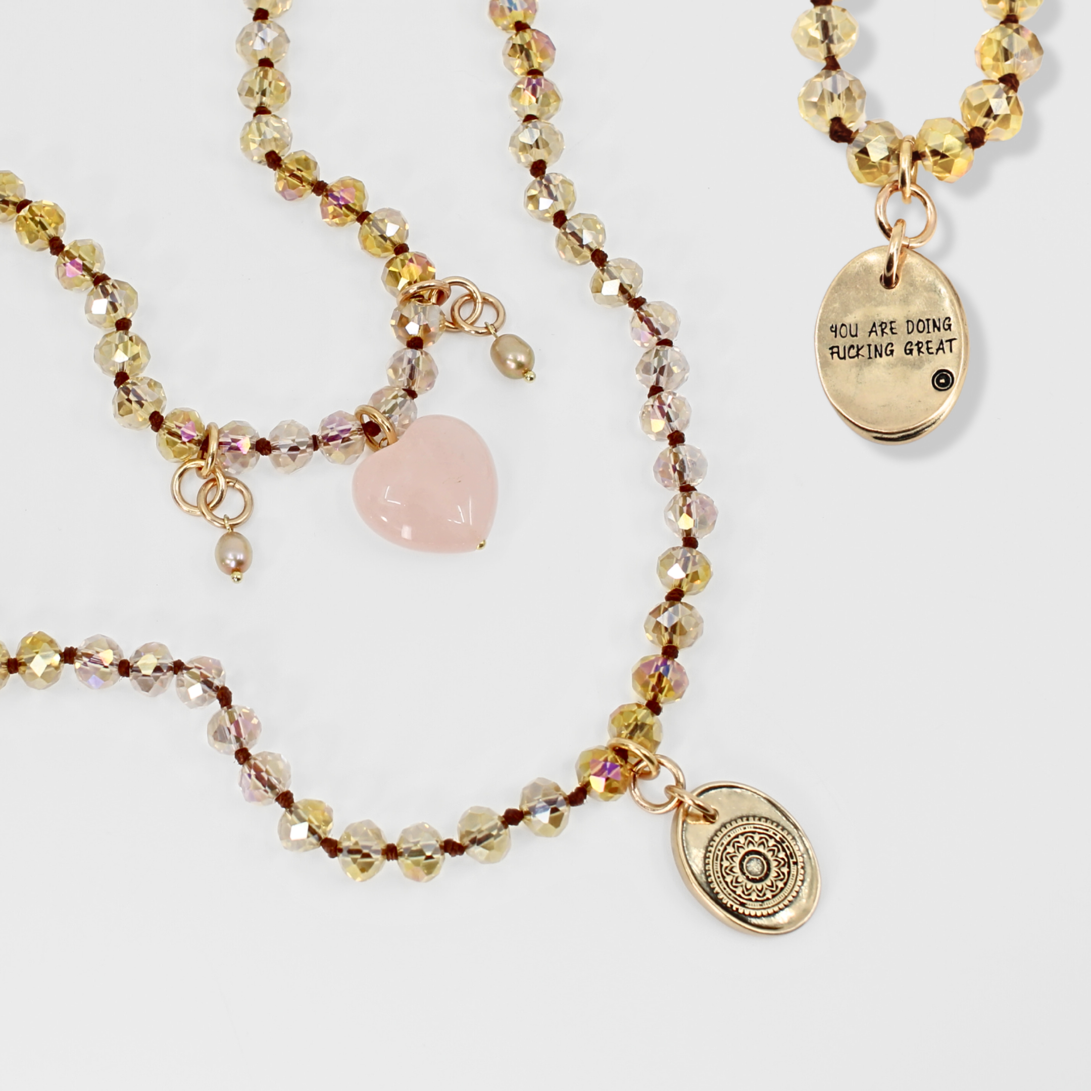 Make a statement that’s equal parts sparkle and strength. This short crystal fusion necklace features faceted beads and a detailed mandala pendant inscribed with the unapologetic reminder: “You Are Doing Fucking Great.” Designed to layer or shine solo, it’s the piece that lifts your spirit while turning heads.