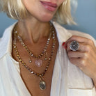 Regular Fusion Full Length: 36-48" **MODELS NECK MEASURES 15" IN CIRCUMFERENCE. PLEASE NOTE THAT NECKLACES MAY LAY DIFFERENTLY BASED ON YOUR MEASUREMENTS**